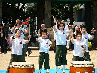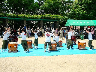 今回は野外イベントという事でいつもの衣装ではなく楽鼓組のTシャツとタイパンツ姿でした。?夏?のような暑さで「この方がいい[:!:]だってすずしいもん」と子ども達も喜んでいたので、夏の間はこのスタイルでたたきましょう。