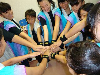 朝から『ワイワイ』あっちこっちで模擬店やバザー、イベントと準備が進められ、私たち楽鼓組も舞台の太鼓の位置確認をした後、衣装に着替えて、円陣を組み気合いを入れました。