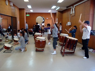 「青空ばやし」「大地」「連」三曲を演奏し2曲目と3曲目の間にはワークショップも行い、たくさんの子どもさん達が和太鼓を体験してくれました。